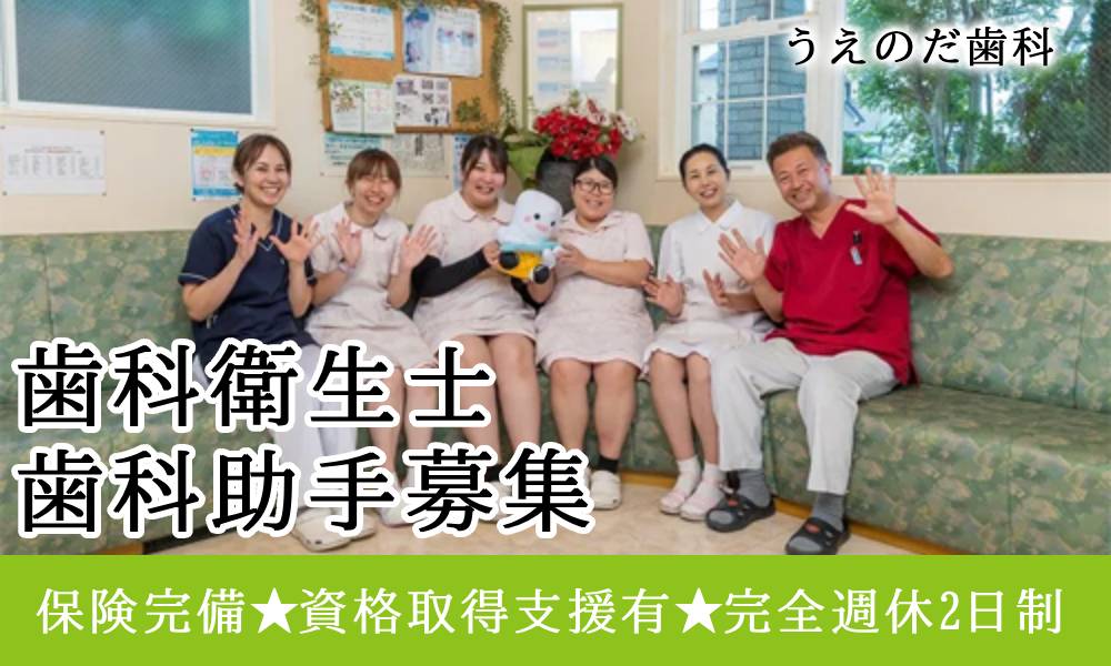 歯科衛生士としてのスキルを存分に活かせる「うえのだ歯科」での仕事は、あなたのキャリアをさらに広げる大きなチャンスです♪一般歯科から矯正歯科、小児歯科まで幅広い分野で活躍することができ、毎日新たな発見と学びの連続です!仕事を通じて患者様の健康をサポートすることのやりがいはもちろん、職員一人ひとりの成長を応援する手厚い資格取得支援制度も充実しています◎特別手当や年2回の賞与といった実績を評価する制度があるため、自分の努力が直に反映され、さらなるモチベーションアップにつながります♪私たちと一緒に地域貢献をしながら、自身の成長を実感できる環境で新たな一歩を踏み出しませんか?皆様のご応募を心よりお待ちしています!