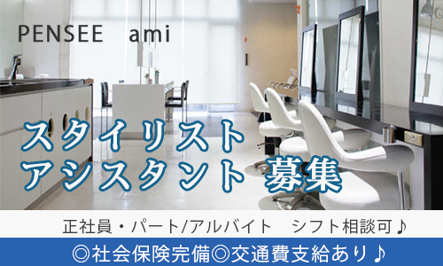 待遇 | 社会保険完備(パートの方は法定通り) 交通費支給(サロン規定あり) 住宅手当あり(正社員のみ・サロン規定あり) |