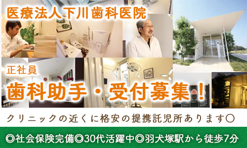 医療法人下川歯科医院は、地域に根ざしたコミュニティ歯科クリニックとして、皆様から愛され続ける存在を目指しています◎当院のチームはプロフェッショナルでありながら、アットホームな雰囲気を大切に♪院内では30代を中心に、若いエネルギーが溢れています☆患者様に笑顔を届けるため、スタッフ一人一人が連携しながらも自分らしく活躍しています。当院は、従業員一人一人の成長をサポートし、それぞれのスキルを活かした働き方を提案します♪
