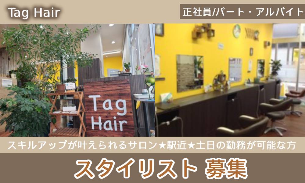 《福岡 博多 吉塚駅スグ》Tag Hairのスタイリスト正社員・パートアルバイト募集中!月給30万円以上可◎社会保険完備◎土日可能時短勤務OK◎交通費支給◎扶養内勤務OK◎ブランクある方◎人柄重視◎風通しのいい職場◎スキルアップ目指せる環境があります!お客様と向き合い“なりたい”を叶える美容室