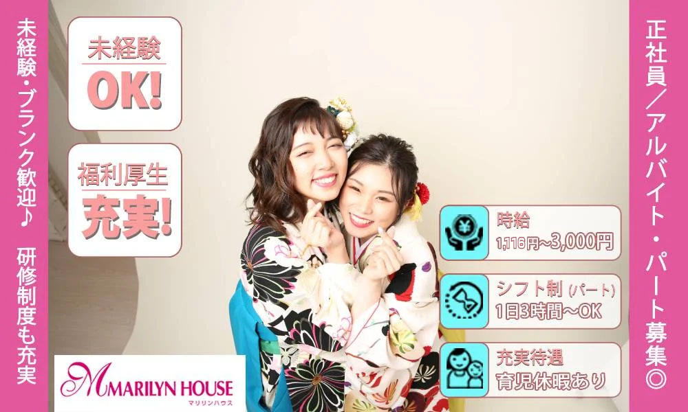 | 給与 | ①貸衣装レンタル専門店での接客スタッフ a)アルバイト・パート 時給:1,116円~ ②ファッションアドバイザー b)正社員 月給:200,000円~250,000円 c)アルバイト・パート 時給:1,116円~ ③WEBデザイナー d)正社員 月給:200,000円~ e)アルバイト・パート 時給:1,116円~ ④着付け師 f)アルバイト・パート 時給:1,116円~3,000円 ⑤ヘアメイク g)アルバイト・パート 時給:1,200円~3,000円 ⑥着物のメンテナンススタッフ h)アルバイト・パート 時給:1,116円~ 着付け師・ヘアメイクスタッフに関しましては、 成人式、卒業式の単発スタッフも募集しております! |