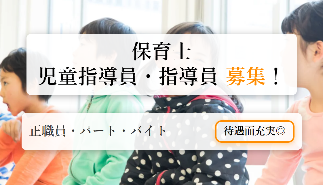 | 職種 | 保育士(正職員) 保育士(パート・バイト) 児童指導員・指導員(児童指導員/指導員)(正職員) 児童指導員・指導員(児童指導員/指導員)(パート・バイト) |