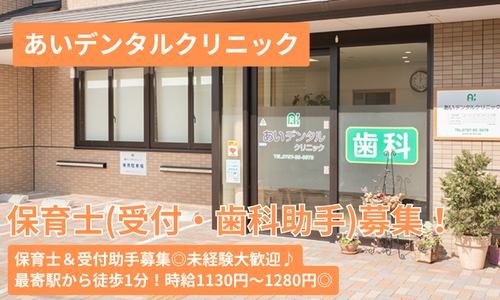 私たちは兵庫県宝塚市清荒神に位置する地域密着型の歯科医院です♪阪急清荒神駅から徒歩1分の好立地で、通勤も便利◎地元の皆さまに愛されるアットホームな環境で、家族や子どもたちの健康を支えるお手伝いをすることを目指しています!今回、保育士資格をお持ちの方を新たに募集しています。実務未経験の方も大歓迎♪優しい先輩スタッフが丁寧にサポートしますので、安心してご応募ください◎