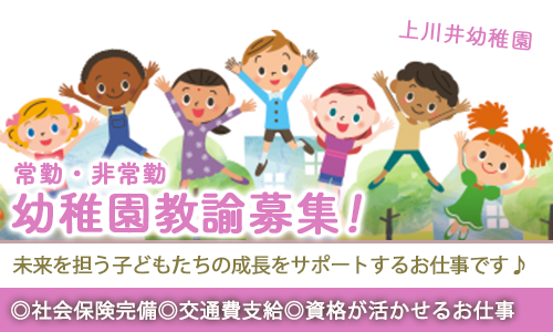 上川井幼稚園は地域に根ざし、子どもたちの笑顔を大切に育む温かい環境を提供しています♪幼児教育に情熱を持ち、未来を担う子どもたちの成長をサポートすることに日々全力を注いでいます◎私たちは、子どもたちとのかかわりを通じて、彼らの可能性を最大限に引き出すお手伝いをしています。教育の現場で活躍する一員となり、ご自身の夢やビジョンを追求しませんか?