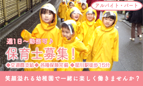 勤務地は横浜市保土ヶ谷区鎌谷町で、アクセスも便利◎「星川駅」から徒歩15分、横浜駅からも歩いて通える距離にあります!交通費は全額支給されるので、安心して通勤できます♪私たちの幼稚園は、アットホームでにぎやかな職場◎多くのスタッフが長期間働き続けているのが特徴です。これからも安心して長く働ける環境をご用意していますので、一緒に素晴らしい時間を過ごしませんか?