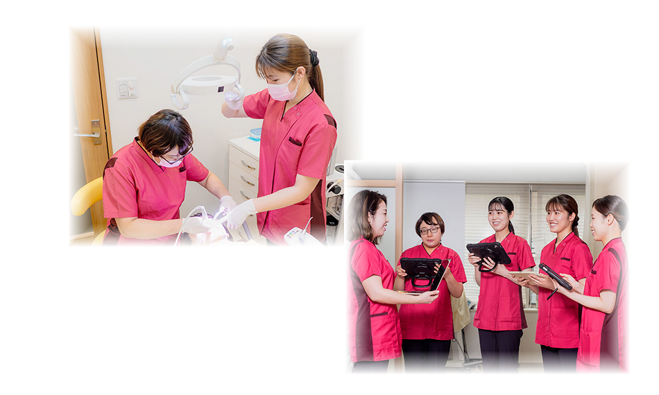 私たちは「よいと思った提案はすぐに採用する」という柔軟さを持ち、最新機器の導入や治療法の改善にも積極的です。歯科衛生士は担当制で患者さまの経時的な変化をしっかり見届けられ、歯科助手は一般的なアシスト業務に加えて、独自のカウンセリングシステムを通じて患者さまと深く関わる役割を担います。未経験からでも学びながら成長できる環境を整えており、チーム全員が一丸となって「患者さまの笑顔のために行動する」医院です。