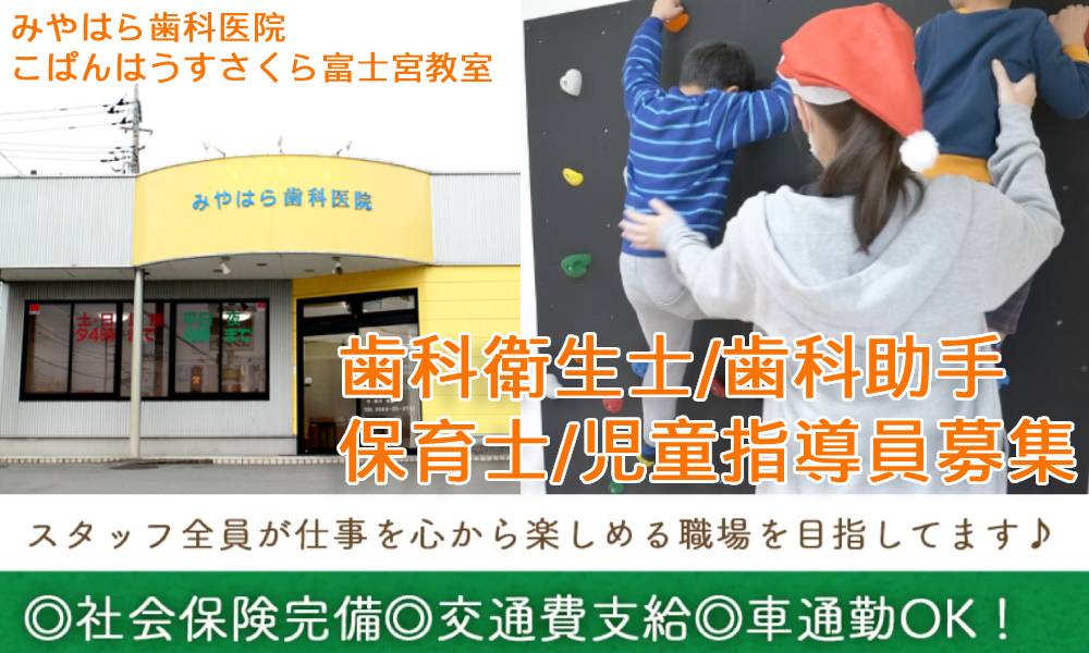 | 時間 | 【みやはら歯科医院】 月〜金 9:30~12:30/14:30~20:00 (休憩3時間) 月4回/午後出勤 14:30~ (休憩45分) 土日 9:30~16:00 (休憩45分) 平均残業時間:22時間/月 週1日勤務から相談可(パート・アルバイト勤務希望の方) 【こぱんはうすさくら富士宮教室】 《正社員》 9:00~18:00 ※実働8時間/休憩1時間 ※残業ほぼなし 《パート・アルバイト》 9:00~18:00内で1日4時間~ 9:00~16:00または10:00~17:00(各休憩1時間)で勤務できる方は特に優遇 ※週1日~勤務OK/週2日以上OK ※残業ほぼなし ※扶養内勤務OK/短時間勤務OK ※平日のみOK/土日のみOK 土日祝に勤務できる方は特に優遇します! ※午前のみOK 午後のみOK ※WワークOK/副業OK ※勤務時間・曜日応相談 家庭の都合などお気軽にご相談ください! |