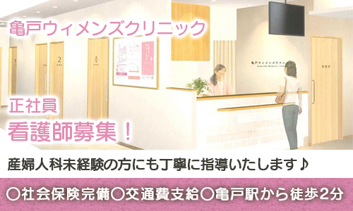 【看護師 求人】亀戸駅より徒歩2分|月給28万~|社会保険完備◎昇給・賞与あり◎交通費支給◎|週休2.5日制【江東区・亀戸ウィメンズクリニック】