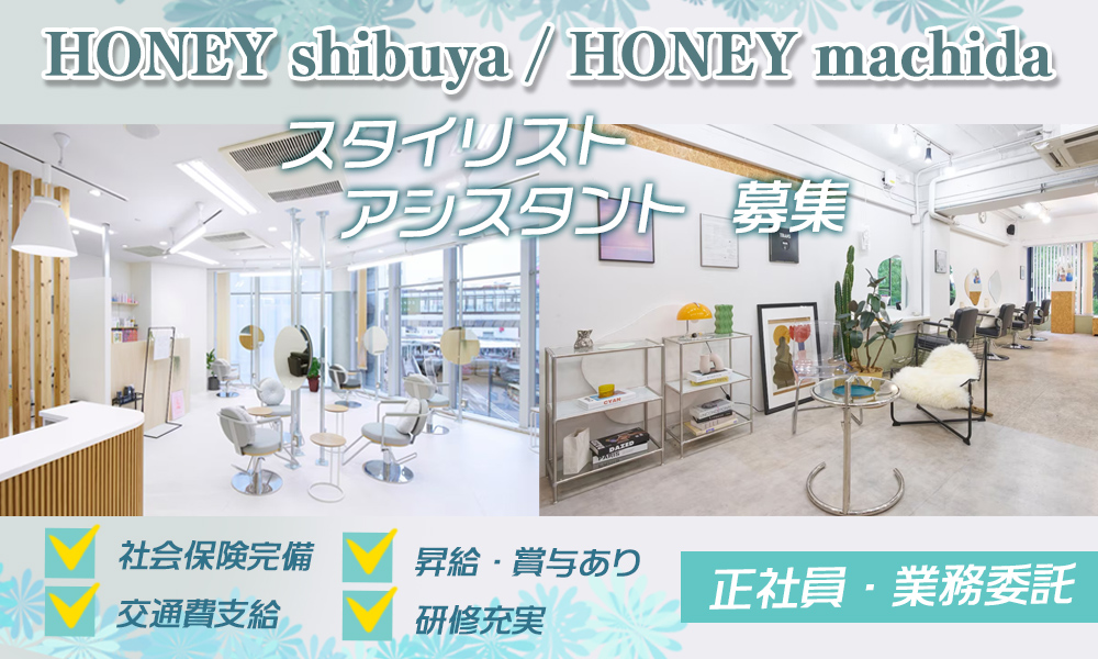 | 時間 | 【HONEY shibuya】 《正社員》 希望シフト制(休日がシフト制) 11:00 - 21:00(1日の労働時間 7時間 - 8時間/変形労働時間制) 週4~5勤務 【HONEY machida】 《正社員》 希望シフト制(休日がシフト制) 10:00 - 20:00(1日の労働時間 7時間 - 8時間/変形労働時間制) 週4~5勤務 《業務委託》 自由出勤制 10:00~20:00など店舗応相談 |