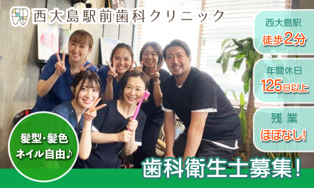 【歯科衛生士求人】年間休日125日以上/有給取得率100%/残業ほぼなし/福利厚生充実/髪型、髪色、ネイル自由|西大島駅前歯科クリニック(江東区大島)